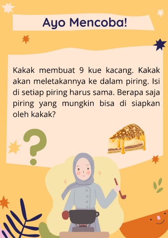 Ayo Mencoba! Kakak membuat 9 kue kacang. Kakak akan meletakannya ke dalam piring. Isi di setiap piring harus sama. Berapa saja piring yang mungkin bisa di siapkan oleh kakak?
