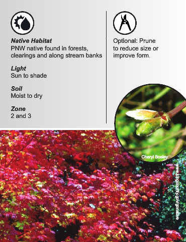 Native Habitat Optional: Prune PNW native found in forests, to reduce size or clearings and along stream banks improve form. Light Sun to shade Soil Moist to dry Zone 2 and 3 Cheryl Bosley www.kingcounty.gov/gonative