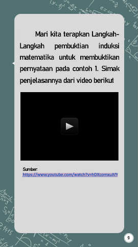 Mari kita terapkan Langkah- Langkah pembuktian induksi matematika untuk membuktikan pernyataan pada contoh 1. Simak penjelasannya dari video berikut Sumber: https://www.youtube.com/watch?v=hDXcomxuAfY 9