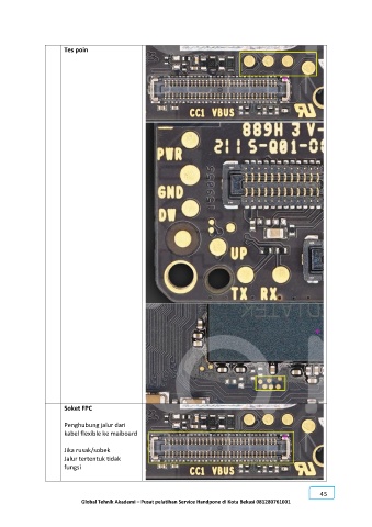 Tes poin Soket FPC Penghubung jalur dari kabel flexible ke maiboard Jika rusak/sobek Jalur tertentuk tidak fungsi 45 Global Tehnik Akademi – Pusat pelatihan Service Handpone di Kota Bekasi 081280761001