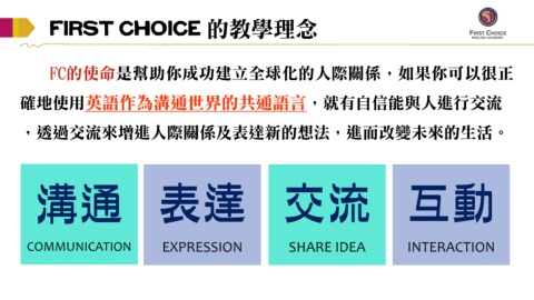 First Choice 的教學理念 FC的使命是幫助你成功建立全球化的人際關係,如果你可以很正 確地使用英語作為溝通世界的共通語言,就有自信能與人進行交流 ,透過交流來增進人際關係及表達新的想法,進而改變未來的生活。 溝通 表達 交流 互動 COMMUNICATION EXPRESSION SHARE IDEA INTERACTION