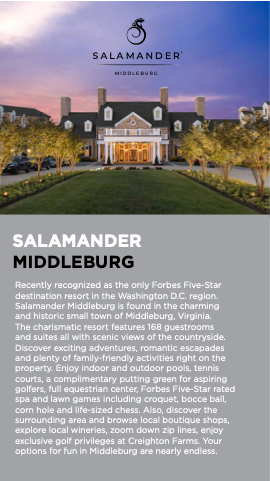 Recently recognized as the only Forbes Five-Star destination resort in the Washington D.C. region. Salamander Middleburg is found in the charming and historic small town of Middleburg, Virginia.