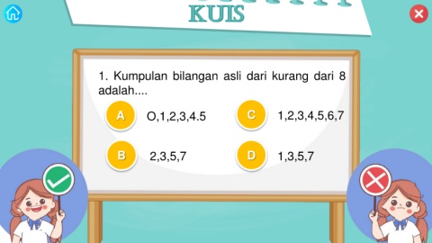 1. Kumpulan bilangan asli dari kurang dari 8 adalah.... A O,1,2,3,4.5 C 1,2,3,4,5,6,7 B 2,3,5,7 D 1,3,5,7