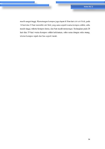 14 hari dan 21 hari memiliki ciri fisik yang sama seperti warna kompos coklat, suhu