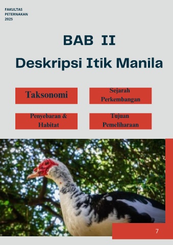 FAKULTAS PETERNAKAN 2025 BAB II Deskripsi Itik Manila Sejarah Taksonomi Perkembangan Penyebaran & Tujuan Habitat Pemeliharaan 7
