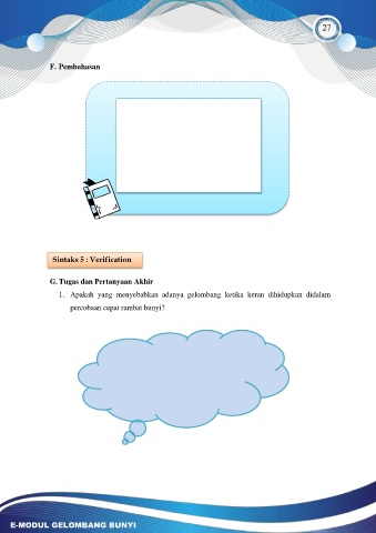 27 F. Pembahasan Sintaks 5 : Verification G. Tugas dan Pertanyaan Akhir 1. Apakah yang menyebabkan adanya gelombang ketika keran dihidupkan didalam percobaan cepat rambat bunyi? E-MODUL GELOMBANG BUNYI