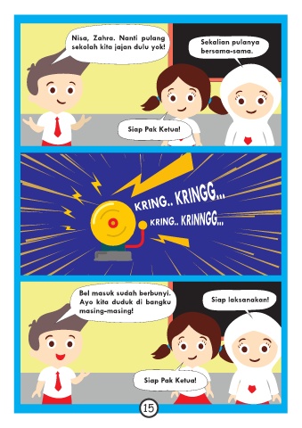 Nisa, Zahra. Nanti pulang Sekalian pulanya sekolah kita jajan dulu yok! bersama-sama. Siap Pak Ketua! Bel masuk sudah berbunyi. Ayo kita duduk di bangku Siap laksanakan! masing-masing! Siap Pak Ketua! 4 15