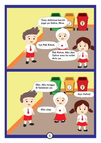 Yeay akhirnya bersih juga ya Zahra, Nisa. ORGANIK ANORGANIK B3 Iya Pak Ketua. Pak Ketua, Aku dan Zahra mau ke toilet dulu ya. Oke. Aku tunggu di halaman ya. ORGANIK ANORGANIK B3 Ayo Zahra! Oke siap. 4 6