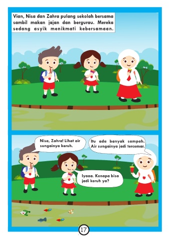 Nisa, Zahra! Lihat air              Itu  ada  banyak  sampah.