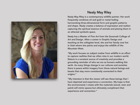 Nealy May Riley is a contemporary wildlife painter. Her work frequently combines oil and gold or metal leafing harmonizing three-dimensional form and graphic patterns and shape. Nealy creates a balance of expression and realism capturing the spiritual essence of animals and placing them in an ethereal symbolic space.