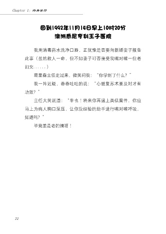 Chapter 1:终身学习 回到1992年11月14日早上10时20分 澳洲悉尼亨利王子医院 我用消毒药水洗净口唇,正犹豫是否要向新婚妻子报告 此事(虽然救人一命,但不知妻子可否接受我嘴对嘴一位老 妇女......) 葛里森主任走过来,微笑问我:“你学到了什么?” 我一阵迟疑,吞吞吐吐的说:“心脏复苏术要及时才有 功效?” 主任大笑说道:“非也!将来你再遇上类似案件,你应 马上为病人胸口泵压,让你没经验的助手进行嘴对嘴呼吸, 知道吗?” 毕竟姜是老的辣呀! 22
