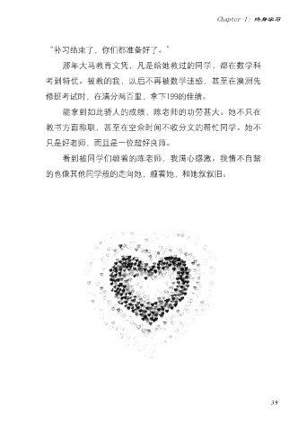 Chapter 1:终身学习 “补习结束了,你们都准备好了。” 那年大马教育文凭,凡是给她教过的同学,都在数学科 考到特优。被教的我,以后不再被数学迷惑,甚至在澳洲先 修班考试时,在满分两百里,拿下199的佳绩。 能拿到如此骄人的成绩,陈老师的功劳甚大。她不只在 教书方面称职,甚至在空佘时间不收分文的帮忙同学。她不 只是好老师,而且是一位超好良师。 看到被同学们缠着的陈老师,我满心感激。我情不自禁 的也像其他同学般的走向她,缠着她,和她叙叙旧。 39