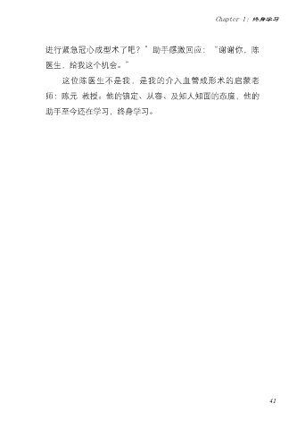 Chapter 1:终身学习 进行紧急冠心成型术了吧?”助手感激回应:“谢谢你,陈 医生,给我这个机会。” 这位陈医生不是我,是我的介入血管成形术的启蒙老 师:陈元啰教授。他的镇定、从容、及知人知面的态度,他的 助手至今还在学习,终身学习。 41