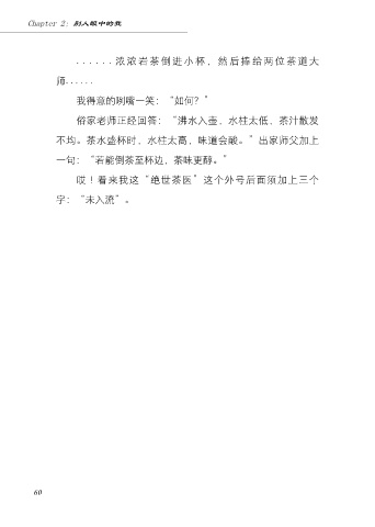 Chapter 2:别人眼中的我 ...... 浓浓岩茶倒进小杯,然后捧给两位茶道大 师...... 我得意的咧嘴一笑:“如何?” 俗家老师正经回答:“沸水入壶,水柱太低,茶汁散发 不均。茶水盛杯时,水柱太高,味道会酸。”出家师父加上 一句:“若能倒茶至杯边,茶味更醇。” 哎!看来我这“绝世茶医”这个外号后面须加上三个 字:“未入流”。 60