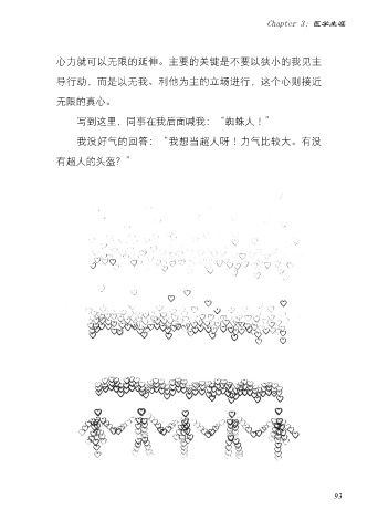Chapter 3:医学生涯 心力就可以无限的延伸。主要的关键是不要以狭小的我见主 导行动,而是以无我、利他为主的立场进行,这个心则接近 无限的真心。 写到这里,同事在我后面喊我:“蜘蛛人!” 我没好气的回答:“我想当超人呀!力气比较大。有没 有超人的头盔?” 93