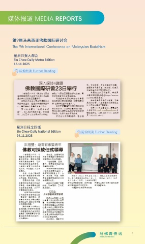 媒体报道 MEDIA REPORTS 第9届马来西亚佛教国际研讨会 The 9th International Conference on Malaysian Buddhism 星洲日报大都会 Sin Chew Daily Metro Edition 15.11.2025 延伸阅读 Further Reading 星洲日报全国版 Sin Chew Daily National Edition 延伸阅读 Further Reading 24.11.2025 5