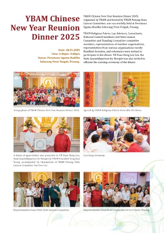 Group photo of YBAM Chinese New Year Reunion Dinner 2025. Speech by YBAM Religious Patron Venerable Chi Chern.