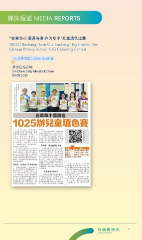 媒体报道 MEDIA REPORTS “峇章华小·爱吾峇章·齐为华小”儿童填色比赛 'SJK(C) Bachang · Love Our Bachang · Together for Our Chinese Primary School' Kid’s Colouring Contest 延伸阅读 Further Reading 星洲日报古城 Sin Chew Daily Melaka Edition 09.09.2025 25