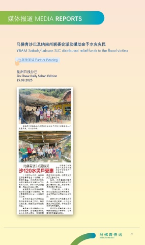 媒体报道 MEDIA REPORTS 马佛青沙巴及纳闽州联委会派发援助金予水灾灾民 YBAM Sabah/Labuan SLC distributed relief funds to the flood victims 延伸阅读 Further Reading 星洲日报沙巴 Sin Chew Daily Sabah Edition 25.09.2025 30