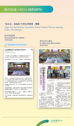 媒体报道 MEDIA REPORTS “走出去,动起来”中学生学佛营 —雪隆 ‘Step Out, Get Moving’ Secondary School Students‘ Dharma Learning Camp –KL/Selangor 南洋商报网站 Nanyang Siang Pau Website 27.08.2025 星洲日报大都会 Sin Chew Daily Metro Edition 延伸阅读 Further Reading 28.08.2025 7