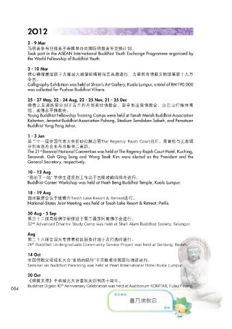 Buddhist Career Workshop was held at Hoeh Beng Buddhist Temple, Kuala Lumpur. 33 Advanced Dharma Study Camp was held at Kinta Buddhist Society, Kampar, Perak.