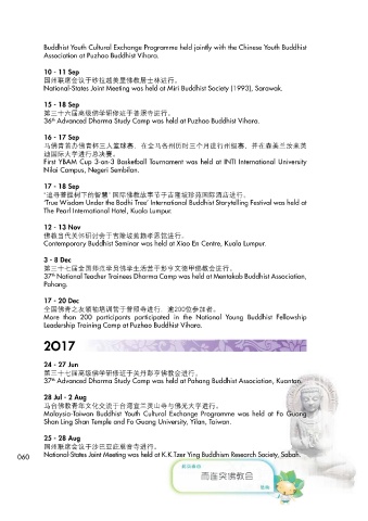 060 National-States Joint Meeting was held at K.K.Tzer Ying Buddhism Research Society, Sabah. 39 National Teacher Trainees Dharma Camp was held at Bandar Utama Buddhist Society, 061