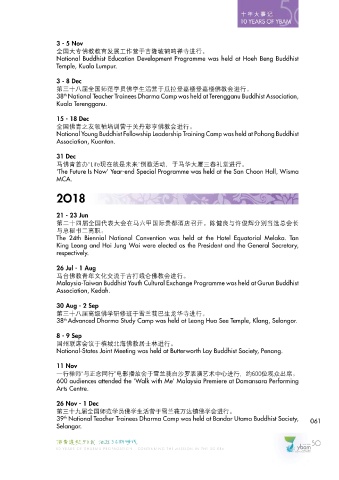 060 National-States Joint Meeting was held at K.K.Tzer Ying Buddhism Research Society, Sabah. 39 National Teacher Trainees Dharma Camp was held at Bandar Utama Buddhist Society, 061