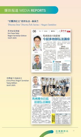 媒体报道 MEDIA REPORTS “甘露洒红尘”巡回弘法—森美兰 ‘Dharma Dew’ Dharma Talk Series— Negeri Sembilan 星洲日报花城 Sin Chew Daily Negeri Sembilan Edition 18.07.2025 中国报今日森美兰 China Press Negeri Sembilan Today Edition 18.07.2025 10
