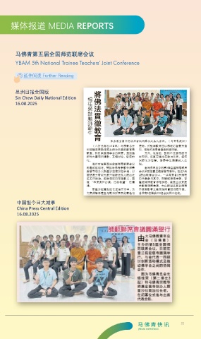媒体报道 MEDIA REPORTS 马佛青第五届全国师范联席会议 YBAM 5th National Trainee Teachers’ Joint Conference 延伸阅读 Further Reading 星洲日报全国版 Sin Chew Daily National Edition 16.08.2025 中国报今日大城事 China Press Central Edition 16.08.2025 22