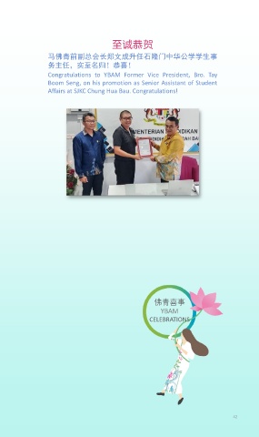 至诚恭贺 马佛青前副总会长郑文成升任石隆门中华公学学生事 务主任,实至名归!恭喜! Congratulations to YBAM Former Vice President, Bro. Tay Boom Seng, on his promotion as Senior Assistant of Student Affairs at SJKC Chung Hua Bau. Congratulations! 佛青喜事 YBAM CELEBRATIONS 42