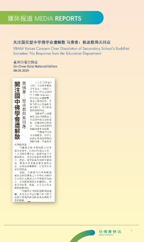 媒体报道 MEDIA REPORTS 关注国民型中学佛学会遭解散 马佛青:致函教局无回应 YBAM Voices Concern Over Dissolution of Secondary School’s Buddhist Societies: No Response from the Education Department 星洲日报全国版 Sin Chew Daily National Edition 08.05.2025 7