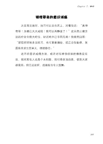 Chapter 7:修行 禅修带来的意识减痛 次日再见她时,她已可以坐在床上,对着我说:“真神 奇呀!身痛已大大减轻!我可以再静坐了!”这另类止痛方 法的疗效令我大吃惊,初试啼声已非同凡响!我微笑回答: “那您好好地多加练习,也可重新诵经,或正念弥勒佛,发 愿将来求生兜率天,继续修行。” 这不经意识减痛方法,或许对有禅修经验的佛教徒有 效,但对其他人还是个未知数,我可得多加改良,使到大家 都受用。但无论如何,成绩相当令人鼓舞。 105