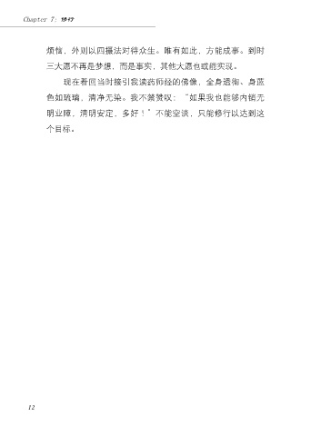 Chapter 7:修行 烦恼,外则以四摄法对待众生。唯有如此,方能成事。到时 三大愿不再是梦想,而是事实,其他大愿也或能实现。 现在看回当时接引我读药师经的佛像,全身透彻、身蓝 色如琉璃,清净无染。我不禁赞叹:“如果我也能够内销无 明业障,清明安定,多好!”不能空谈,只能修行以达到这 个目标。 12
