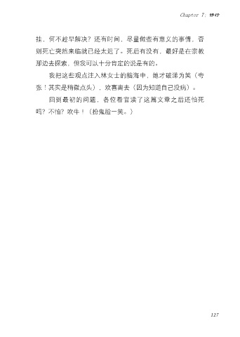 Chapter 7:修行 挂,何不趁早解决?还有时间,尽量做些有意义的事情,否 则死亡突然来临就已经太迟了。死后有没有,最好是在宗教 那边去探索,但我可以十分肯定的说是有的。 我把这些观点注入林女士的脑海中,她才破涕为笑(夸 张!其实是稍微点头),欢喜离去(因为知道自己没病)。 回到最初的问题,各位看官读了这篇文章之后还怕死 吗?不怕?吹牛!(扮鬼脸一笑。) 127