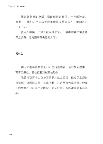 Chapter 8:疫情 接到紧急室的电话,我即刻赶到医院。一见到护士, 问道:“我们的个人防护装备能够支持多久?”她回应: “十七天。” 我点头微笑:“好!可以打仗了。”接着跟着正常步骤 穿上装备,走向隔离营去见病人了。 后记 病人和妻子证实患上H1N1流行性感冒,而非新冠病毒, 两者已痊愈,我也克服对冠病的恐惧。 我曾将我穿个人防护装的照片放上脸书,很多朋友都以 为我到中央医院工作,甚感抱歉,在这里向大家澄清。但真 正的战场不只是在中央医院,而是社区,所以请大家务必小 心。 158
