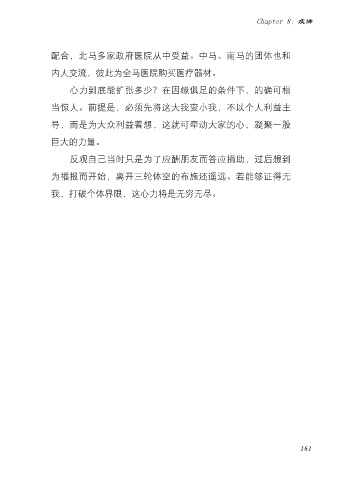 Chapter 8:疫情 配合,北马多家政府医院从中受益。中马、南马的团体也和 内人交流,彼此为全马医院购买医疗器材。 心力到底能扩张多少?在因缘俱足的条件下,的确可相 当惊人。前提是,必须先将这大我变小我,不以个人利益主 导,而是为大众利益着想,这就可牵动大家的心,凝聚一股 巨大的力量。 反观自己当时只是为了应酬朋友而答应捐助,过后想到 为福报而开始,离开三轮体空的布施还遥远。若能够证得无 我,打破个体界限,这心力将是无穷无尽。 161