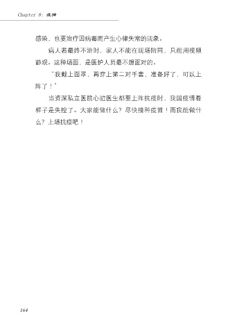 Chapter 8:疫情 感染,也要治疗因病毒而产生心律失常的现象。 病人若最终不治时,家人不能在现场陪同,只能用视频 静观。这种场面,是医护人员最不想面对的。 “我戴上面罩,再穿上第二对手套,准备好了,可以上 阵了!” 当资深私立医院心脏医生都要上阵抗疫时,我国疫情看 样子是失控了。大家能做什么?尽快接种疫苗!而我能做什 么?上场抗疫吧! 164