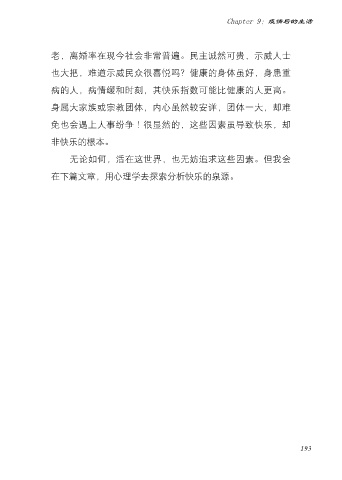 Chapter 9:疫情后的生活 老,离婚率在现今社会非常普遍。民主诚然可贵,示威人士 也大把,难道示威民众很喜悦吗?健康的身体虽好,身患重 病的人,病情缓和时刻,其快乐指数可能比健康的人更高。 身属大家族或宗教团体,内心虽然较安详,团体一大,却难 免也会遇上人事纷争!很显然的,这些因素虽导致快乐,却 非快乐的根本。 无论如何,活在这世界,也无妨追求这些因素。但我会 在下篇文章,用心理学去探索分析快乐的泉源。 193