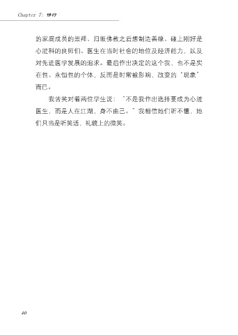 Chapter 7:修行 的家庭成员的崇拜、归皈佛教之后想制造善缘、碰上刚好是 心脏科的良师们、医生在当时社会的地位及经济能力,以及 对先进医学发展的追求。最后作出决定的这个我,也不是实 在性、永恒性的个体,反而是时常被影响,改变的“现象” 而已。 我苦笑对着两位学生说:“不是我作出选择要成为心脏 医生,而是人在江湖,身不由己。”我相信她们听不懂,她 们只当是听笑话,礼貌上的微笑。 40