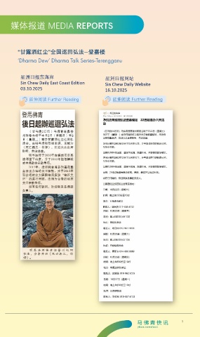 媒体报道 MEDIA REPORTS “甘露洒红尘”全国巡回弘法—登嘉楼 ‘Dharma Dew’ Dharma Talk Series-Terengganu 星洲日报东海岸 星洲日报网站 Sin Chew Daily East Coast Edition Sin Chew Daily Website 03.10.2025 16.10.2025 延伸阅读 Further Reading 延伸阅读 Further Reading 9