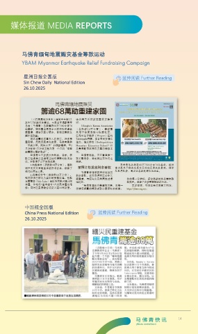 媒体报道 MEDIA REPORTS 马佛青缅甸地震赈灾基金筹款运动 YBAM Myanmar Earthquake Relief Fundraising Campaign 星洲日报全国版 延伸阅读 Further Reading Sin Chew Daily National Edition 26.10.2025 中国报全国版 China Press National Edition 延伸阅读 Further Reading 26.10.2025 14