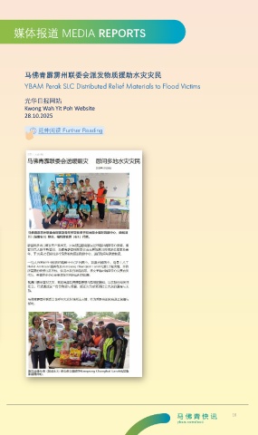媒体报道 MEDIA REPORTS 马佛青霹雳州联委会派发物质援助水灾灾民 YBAM Perak SLC Distributed Relief Materials to Flood Victims 光华日报网站 Kwong Wah Yit Poh Website 28.10.2025 延伸阅读 Further Reading 16