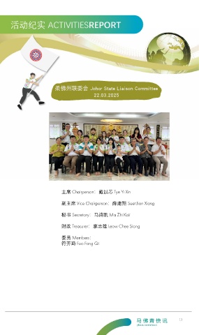 柔佛州联委会 Johor State Liaison Committee 22.03.2025 主席 Chairperson:戴以芯 Tye Yi Xin 副主席 Vice Chairperson:薛建翔 Seet Jian Xiang 秘书 Secretary:马诗凯 Ma Zhi Kaii 财政 Treasurer:廖志雄 Leow Chee Siong 委员 Members: 符芳琦 Foo Fang Qi 11