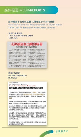 法师被盗名出现台联署 马佛青限24小时内移除 Venerables' Name was Misappropriated in Taiwan Petition YBAM Calls for Removal of Names within 24 Hours 星洲日报全国版 Sin Chew Daily National Edition 10.03.2025 星洲日报网站 Sin Chew Daily Website 09.03.2025 19