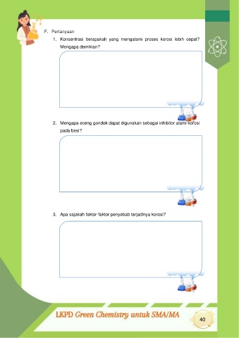 F. Pertanyaan 1. Konsentrasi berapakah yang mengalami proses korosi lebih cepat? Mengapa demikian? 2. Mengapa eceng gondok dapat digunakan sebagai inhibitor alami korosi pada besi? 3. Apa sajakah faktor-faktor penyebab terjadinya korosi? 40