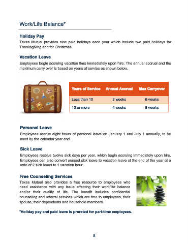Texas Mutual provides nine paid holidays each year which include two paid holidays for