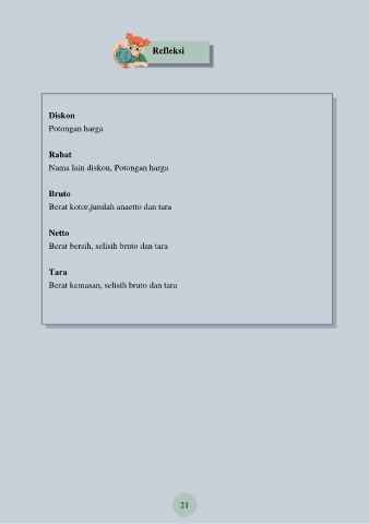 Refleksi Diskon Potongan harga Rabat Nama lain diskon, Potongan harga Bruto Berat kotor,jumlah anaetto dan tara Netto Berat bersih, selisih bruto dan tara Tara Berat kemasan, selisih bruto dan tara 21