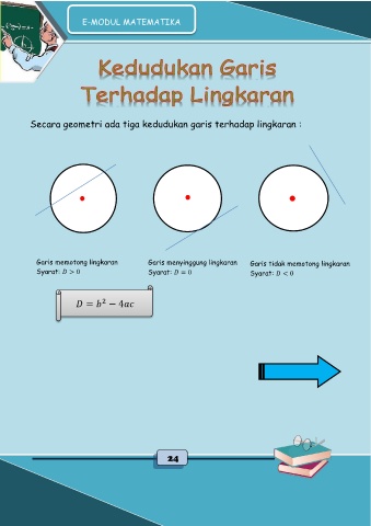 E-MODUL MATEMATIKA Secara geometri ada tiga kedudukan garis terhadap lingkaran : Garis memotong lingkaran Garis menyinggung lingkaran Garis tidak memotong lingkaran Syarat: > 0 Syarat: = 0 Syarat: < 0 = − 4 2