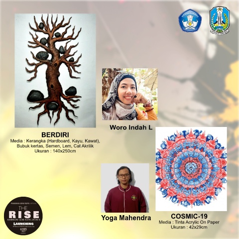 Woro Indah L BERDIRI Media : Kerangka (Hardboard, Kayu, Kawat), Bubuk kertas, Semen, Lem, Cat Akrilik Ukuran : 140x250cm Yoga Mahendra COSMIC-19 Media : Tinta Acrylic On Paper Ukuran : 42x29cm