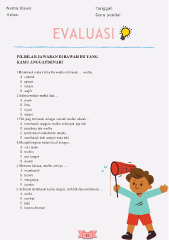 Nama Siswa: Tanggal: Kelas: Guru penilai: EVALUASI PILIHLAH JAWABAN DI BAWAH INI YANG KAMU ANGGAP BENAR! 1. Membasuh muka ketika berwudhu termasuk … wudhu. A. sunnah B. syarat C. rukun D. wajib 2. Rukun wudhu terdiri dari … A. enam B. lima C. tujuh D. empat 3. Hal yang termasuk sebagai sunnah wudhu adalah … A. membasuh anggota wudhu sebanyak tiga kali B. membaca niat wudhu C. tertib dalam melakukan wudhu D. membasuh kaki sampai mata kaki 4.Menghilangkan hadats kecil dengan … A. cuci muka B. wudhu C. cuci tangan D. mandi 5. Menurut bahasa, wudhu artinya … A. membasuh B. bersih C. mengusap D. teratur 6. Sebelum membasuh kedua tangan , terlebih dulu membasuh … A. muka B. rambut C. kaki D. kumur-kumur 12